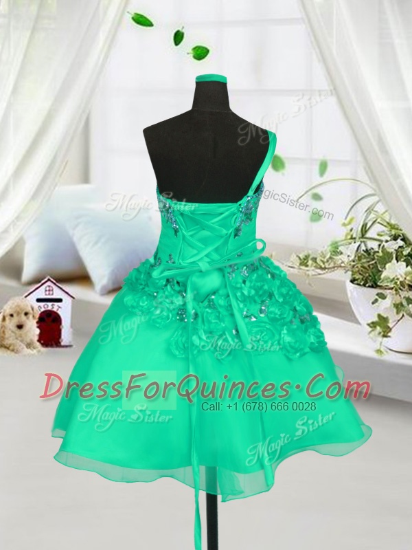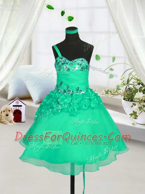 Knee Length Turquoise Flower Girl Dresses One Shoulder Sleeveless Lace Up