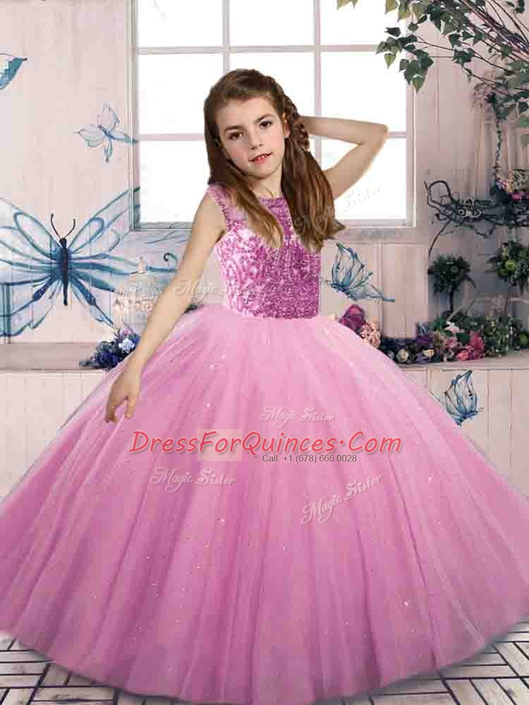 Latest Lilac Ball Gowns Scoop Sleeveless Tulle Floor Length Lace Up Beading Child Pageant Dress