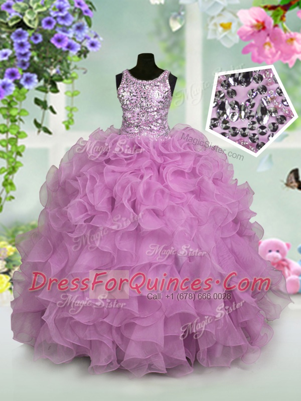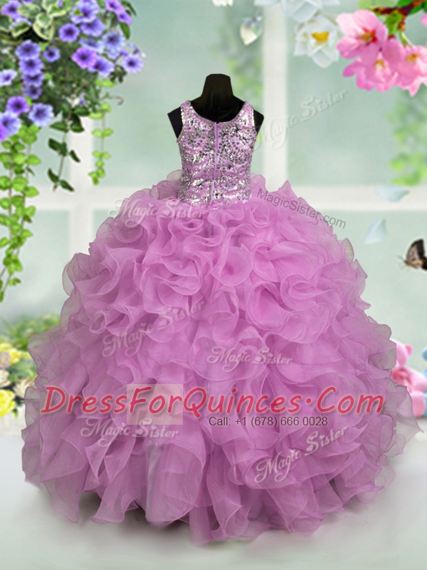 Lilac Ball Gowns Organza Scoop Sleeveless Ruffles and Sequins Floor Length Zipper Flower Girl Dress