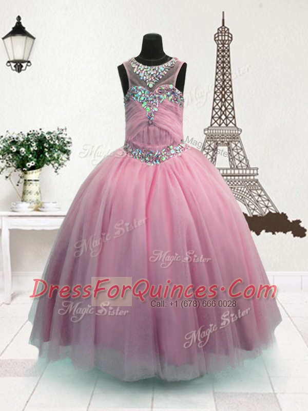 Lovely Scoop Floor Length Zipper Flower Girl Dress Pink for Party and Wedding Party with Beading