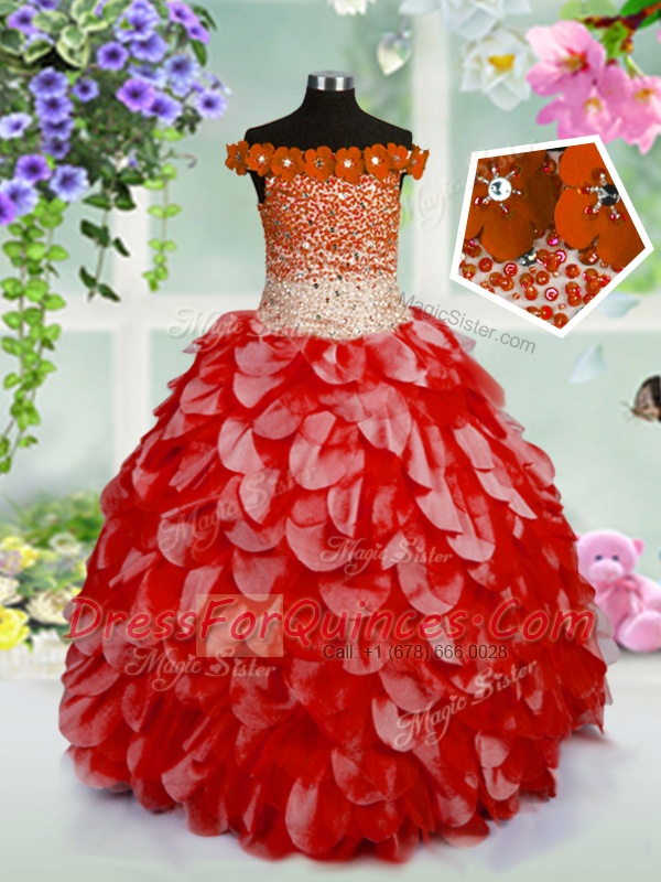 New Style Off the Shoulder Organza Sleeveless High Low Flower Girl Dresses for Less and Beading and Hand Made Flower