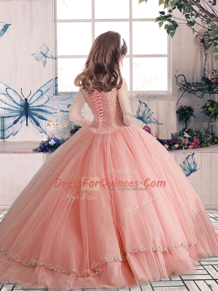Off The Shoulder Sleeveless Lace Up Little Girl Pageant Gowns Tulle