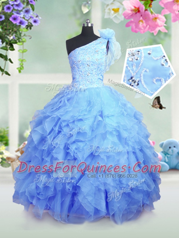 One Shoulder Sleeveless Organza Toddler Flower Girl Dress Beading and Ruffles Lace Up