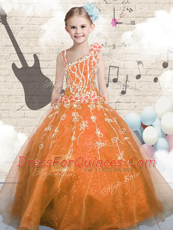 Orange Sleeveless Appliques Floor Length Flower Girl Dresses