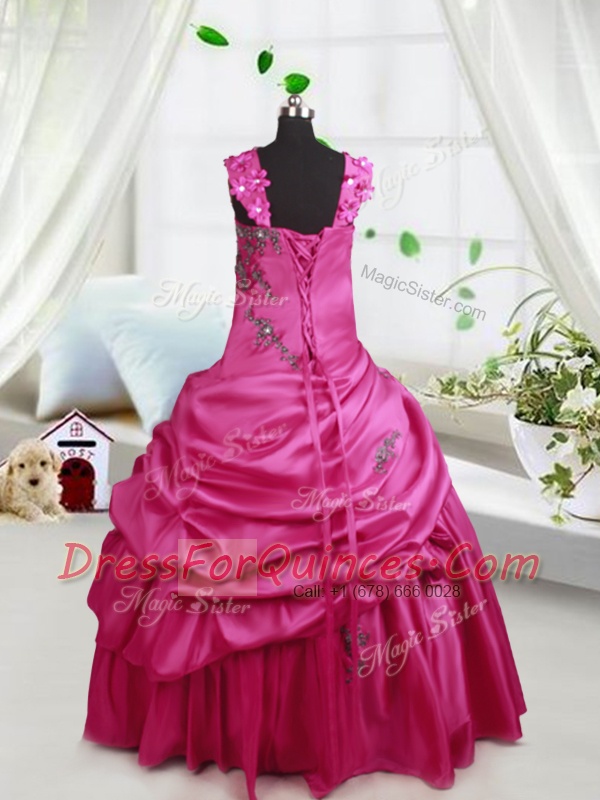 Pick Ups Floor Length Hot Pink Flower Girl Dress Straps Sleeveless Lace Up