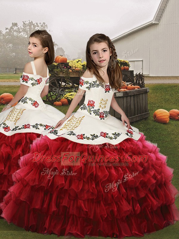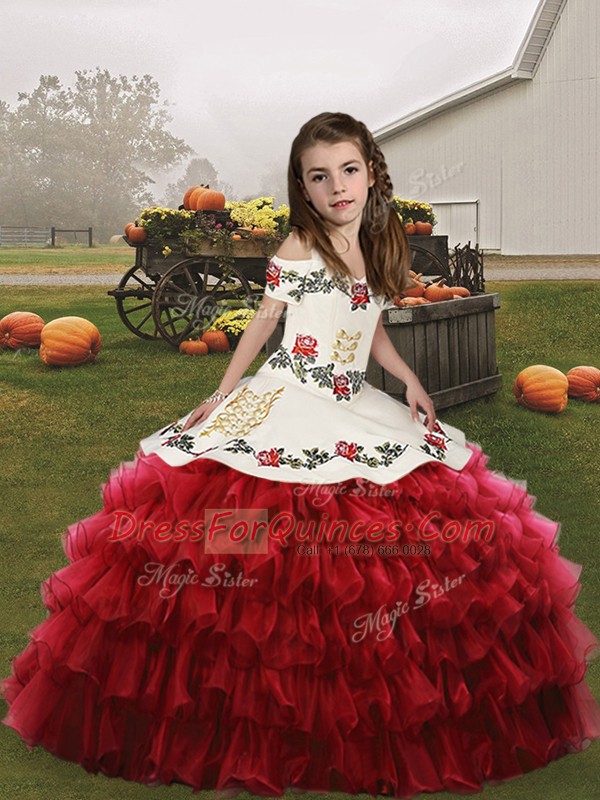 Red Lace Up Child Pageant Dress Embroidery and Ruffled Layers Sleeveless Floor Length