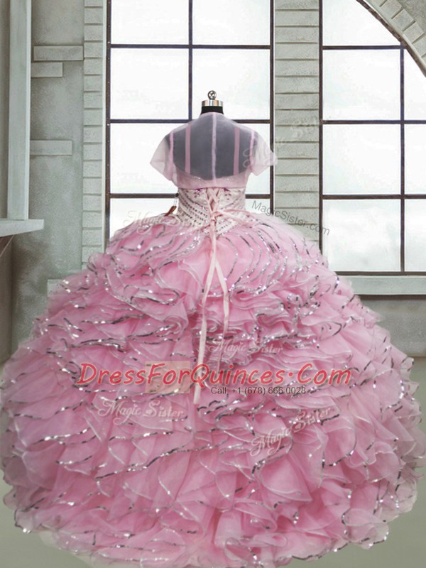 Spaghetti Straps Sleeveless Brush Train Lace Up Kids Pageant Dress Baby Pink Organza