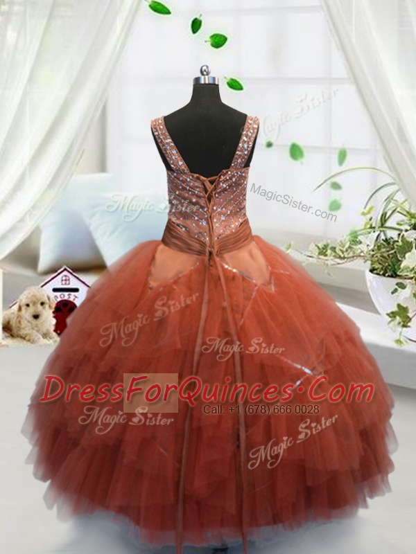 Straps Sleeveless Tulle Flower Girl Dresses Beading and Ruffles Lace Up