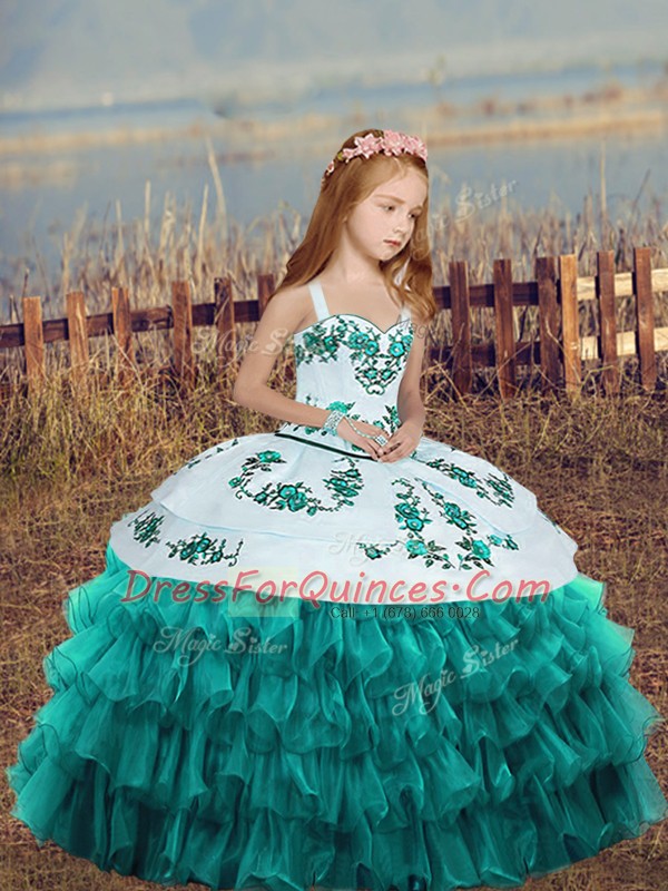 Teal Little Girl Pageant Gowns Party and Wedding Party with Embroidery and Ruffled Layers Straps Sleeveless Lace Up