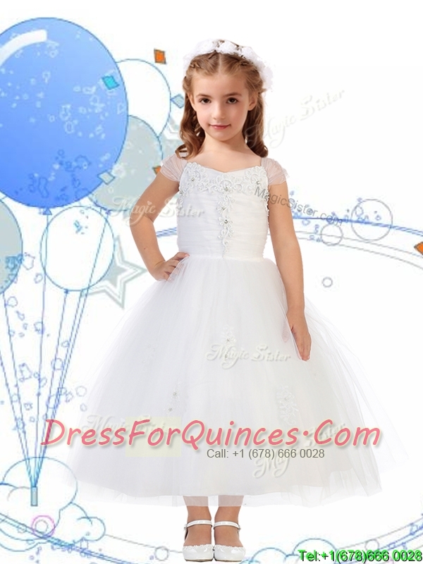 Top Selling Square Cap Sleeves Appliques Mini Quinceanera Dress in White