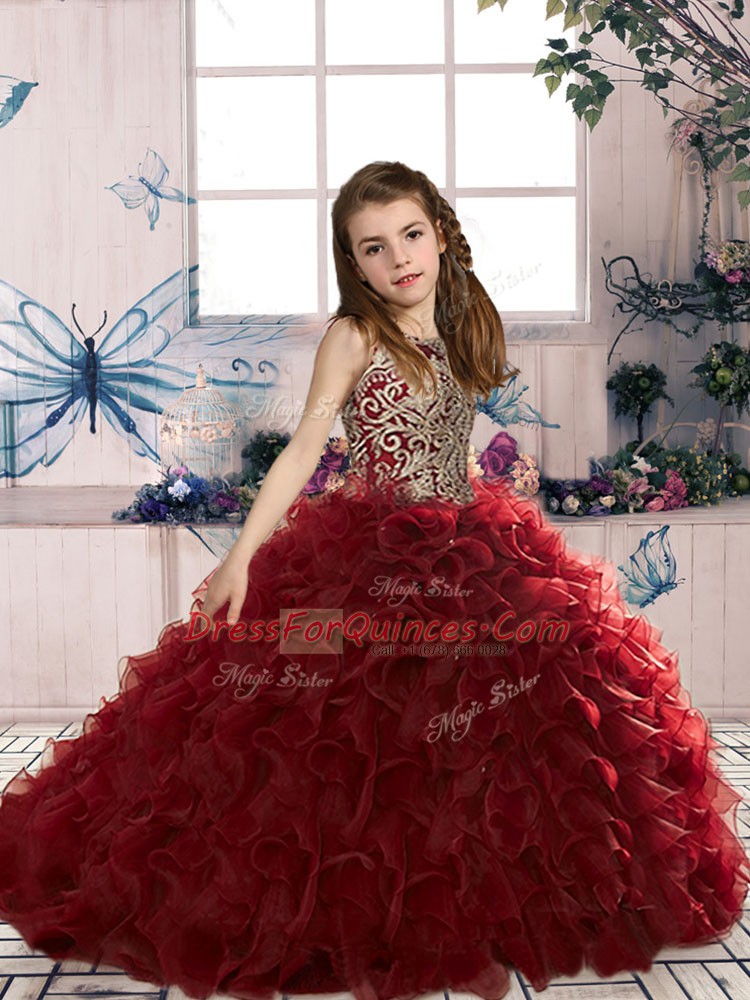 Wine Red Sleeveless Floor Length Beading and Ruffles Lace Up Little Girls Pageant Dress Wholesale
