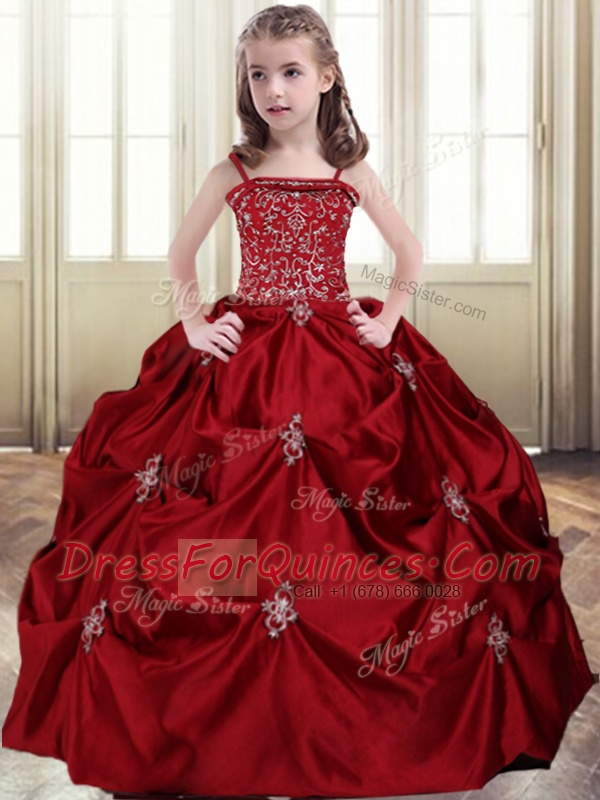 Wine Red Taffeta Lace Up Flower Girl Dresses for Less Sleeveless Floor Length Beading and Pick Ups