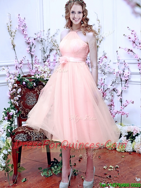 Beautiful Halter Top Baby Pink Dama Dresses with Hand Made Flowers