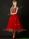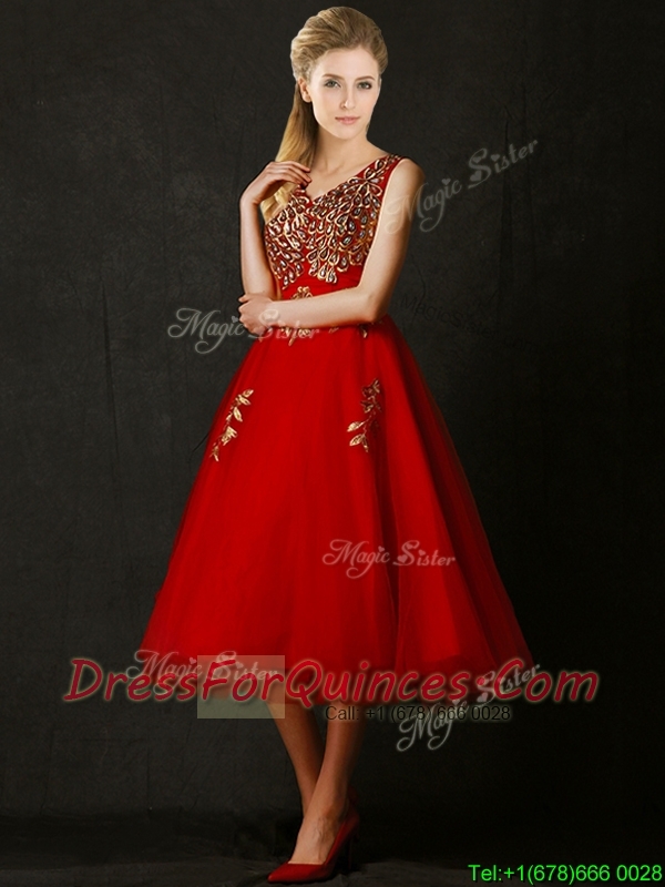 Beautiful V Neck Tea Length Dama Dresses with Beading and Appliques
