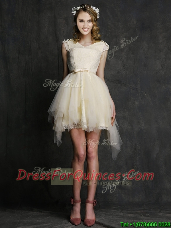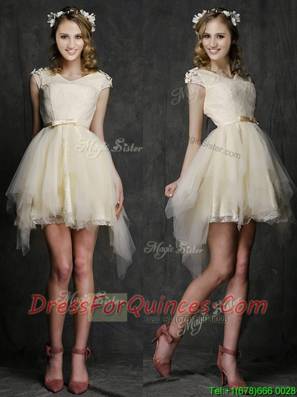 Best V Neck Cap Sleeves Short Dama Dresses with Belt and Appliques