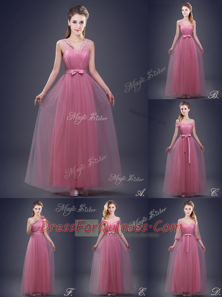 Dynamic Ruching and Bowknot Quinceanera Court of Honor Dress Pink Lace Up Half Sleeves Floor Length