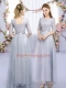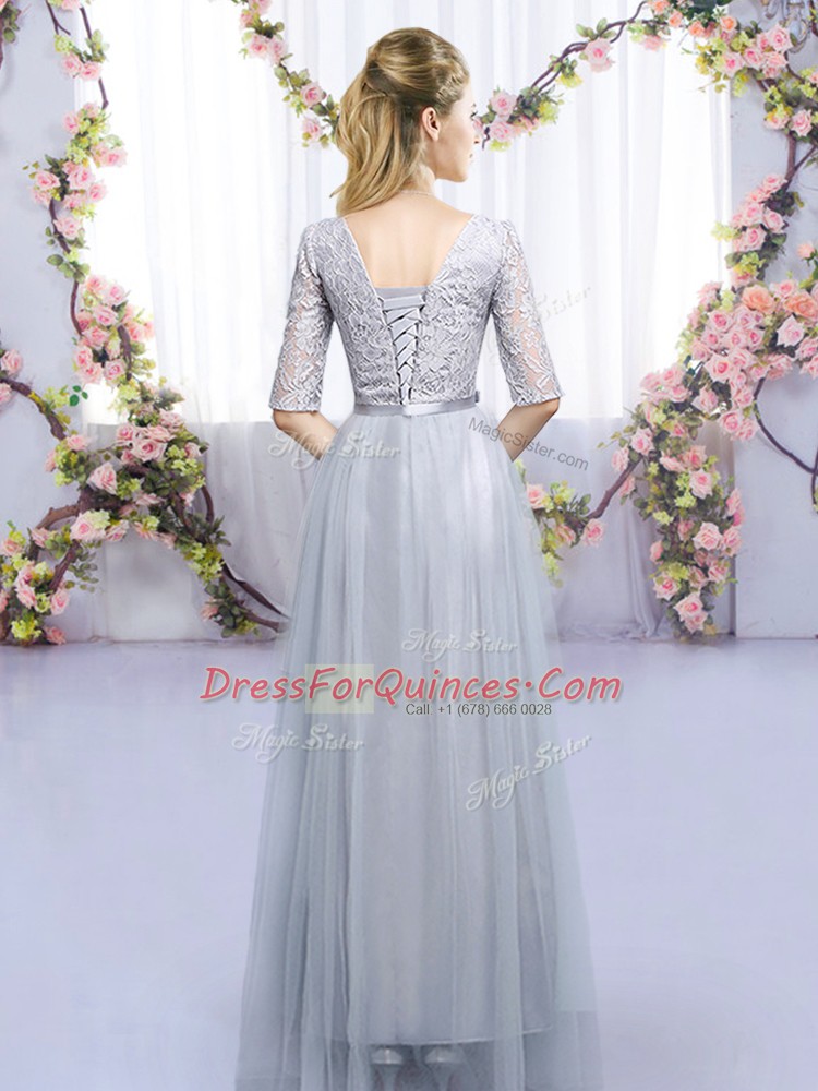 Grey Empire Scoop Half Sleeves Tulle Floor Length Lace Up Lace and Belt Dama Dress
