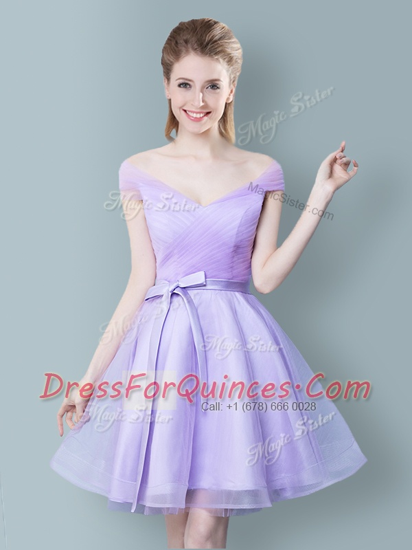 High End Ruching and Bowknot Dama Dress for Quinceanera Lavender Zipper Cap Sleeves Knee Length