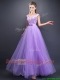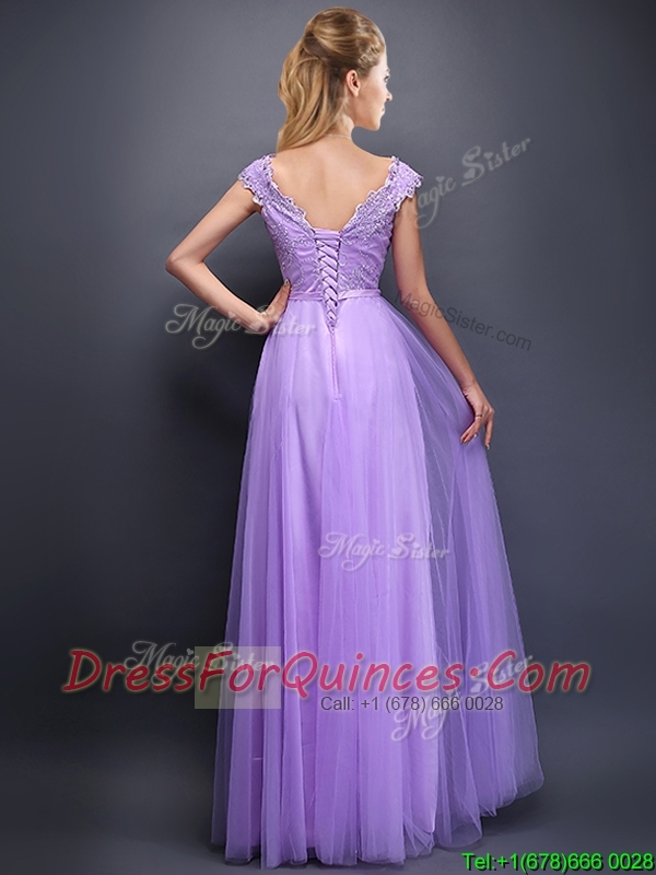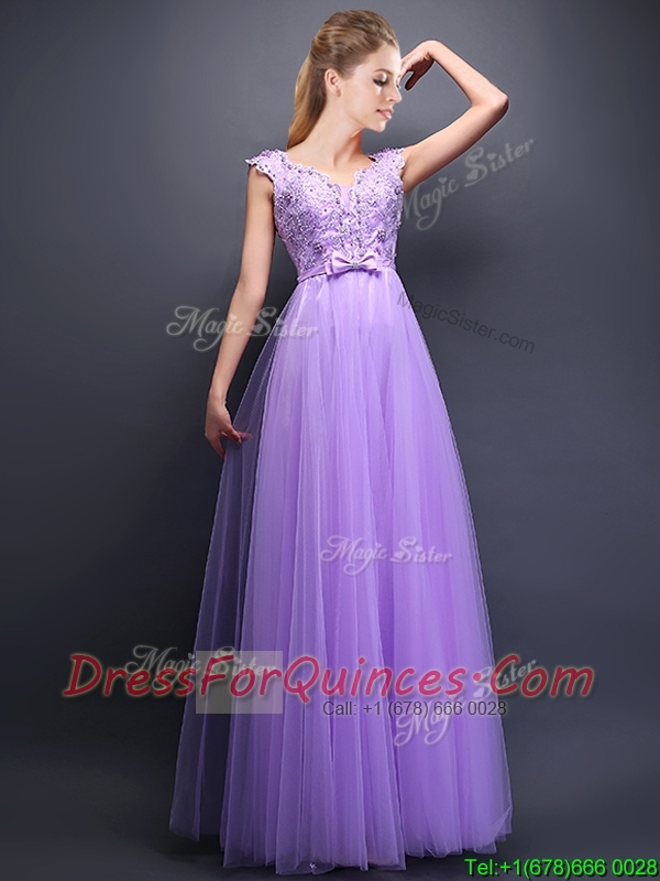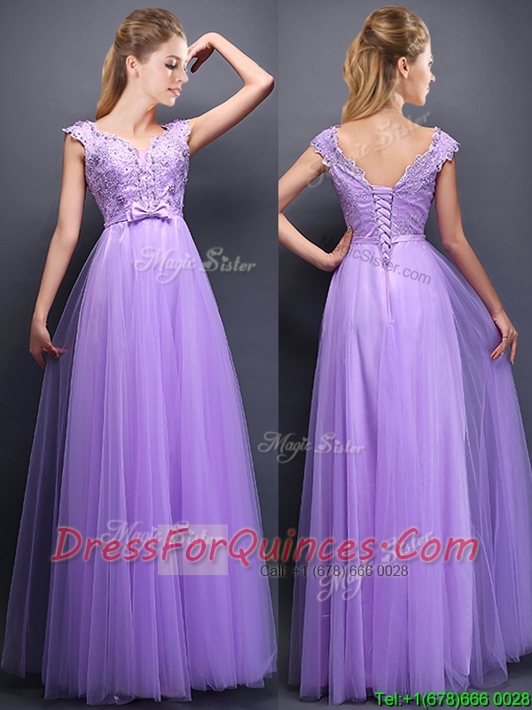 Lovely Beaded and Bowknot V Neck Dama Dresses in Lavender