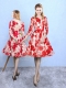 Red Scoop Neckline Pattern Quinceanera Court of Honor Dress 3 4 Length Sleeve Lace Up
