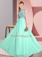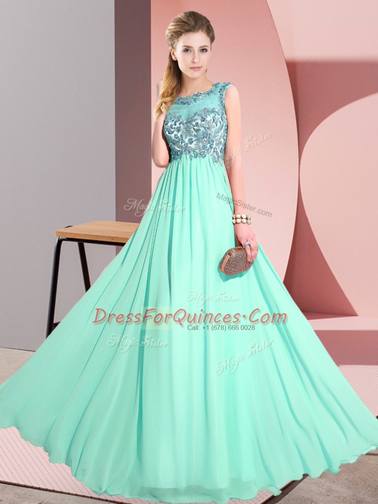 Scoop Sleeveless Vestidos de Damas Floor Length Beading and Appliques Apple Green Chiffon