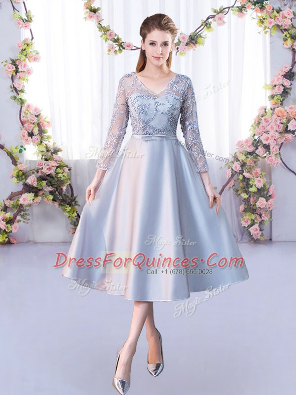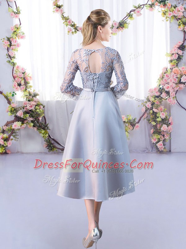 Silver 3 4 Length Sleeve Lace Tea Length Dama Dress for Quinceanera