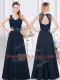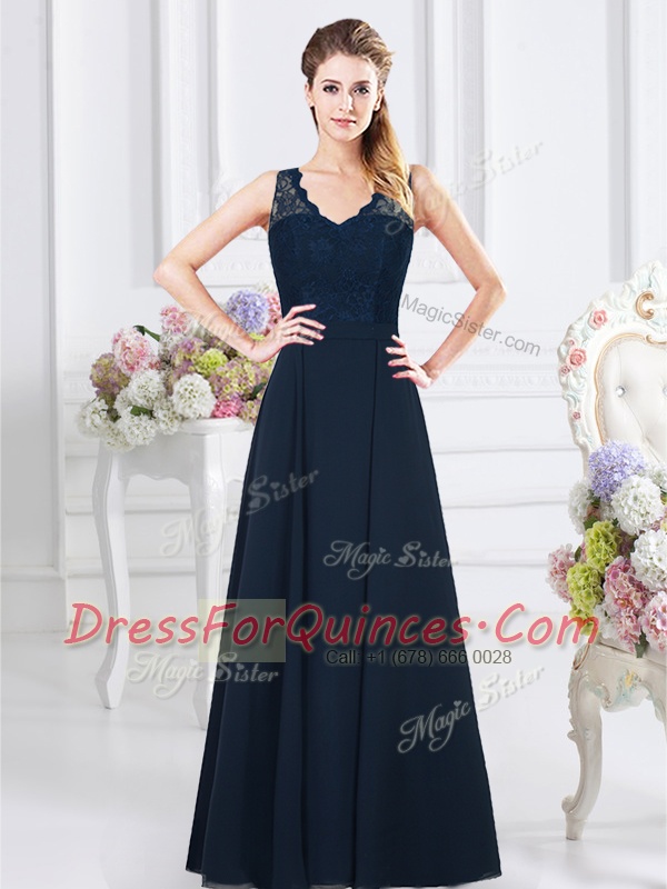Sleeveless Floor Length Lace and Ruching Backless Quinceanera Court of Honor Dress with Navy Blue