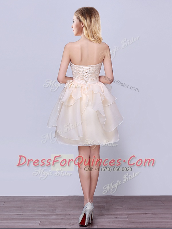 Wonderful Champagne Organza Lace Up Strapless Sleeveless Mini Length Quinceanera Court Dresses Lace and Ruffles and Belt