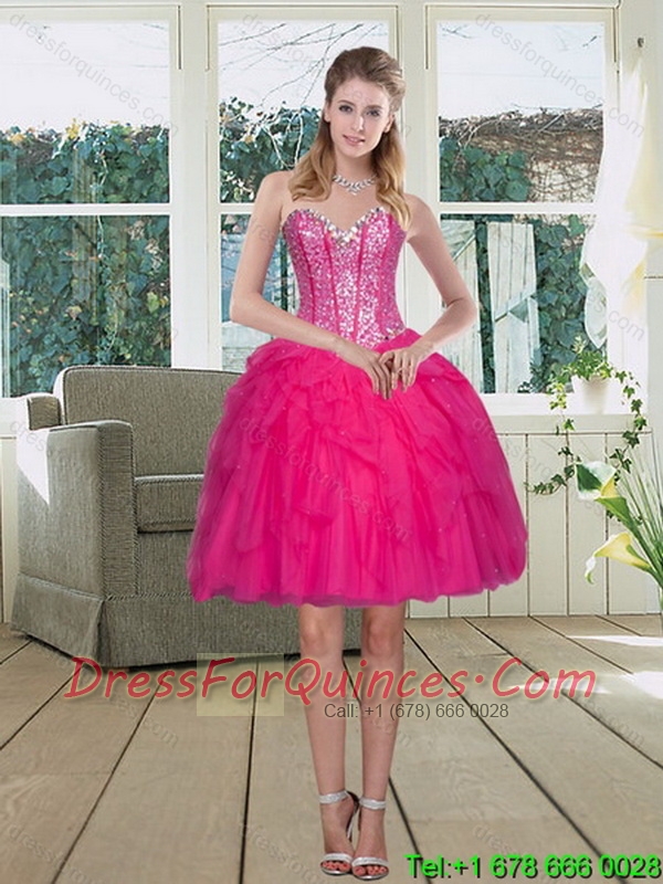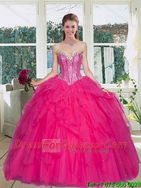 2015 New Styles Hot Pink Sweet 15 Dress with Ruffles and Beading
