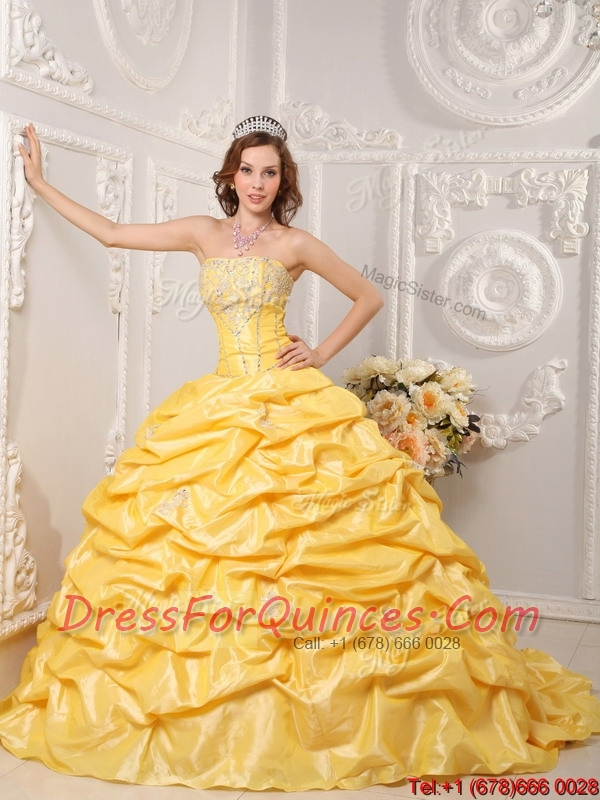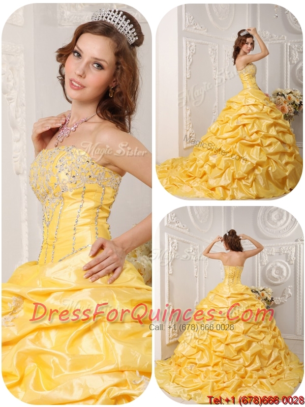 2016 New Styles Pick Ups and Appliques Quinceanera Gowns with Court Train