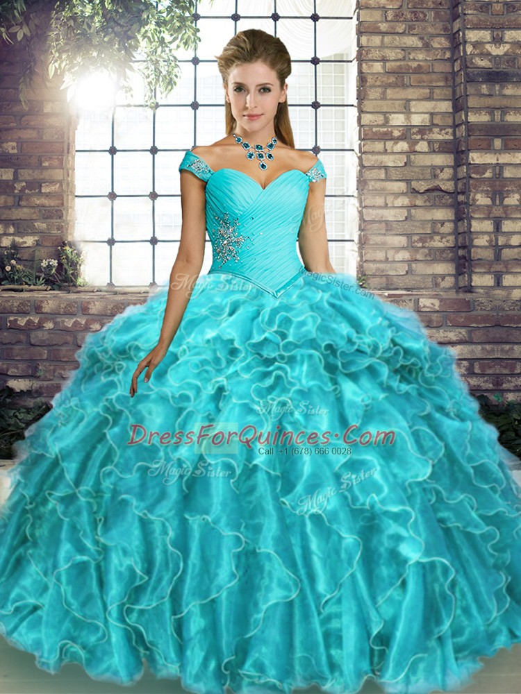 Aqua Blue Lace Up Quinceanera Gown Beading and Ruffles Sleeveless Brush Train