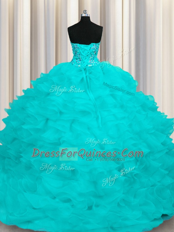Aqua Blue Organza Lace Up 15th Birthday Dress Sleeveless With Train Sweep Train Beading and Ruffles