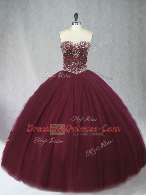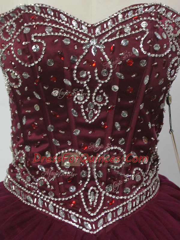 Ball Gowns 15 Quinceanera Dress Burgundy Sweetheart Tulle Sleeveless Floor Length Lace Up