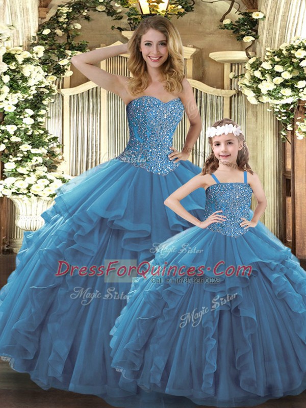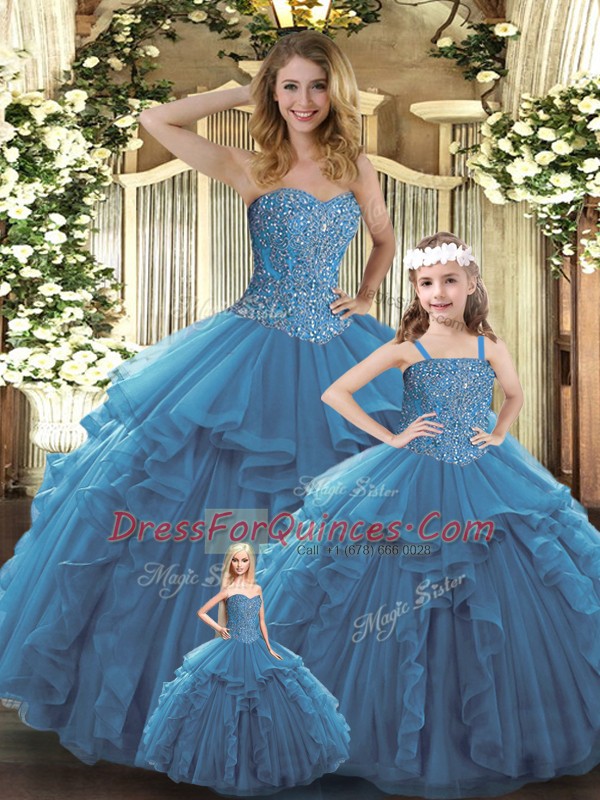 Beautiful Teal Organza Lace Up Sweetheart Sleeveless Floor Length Quinceanera Dress Beading and Ruffles