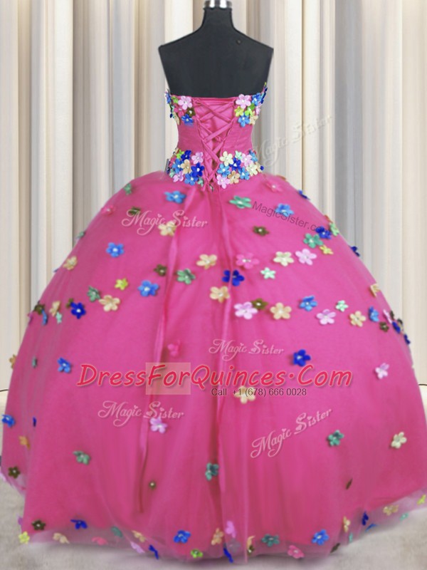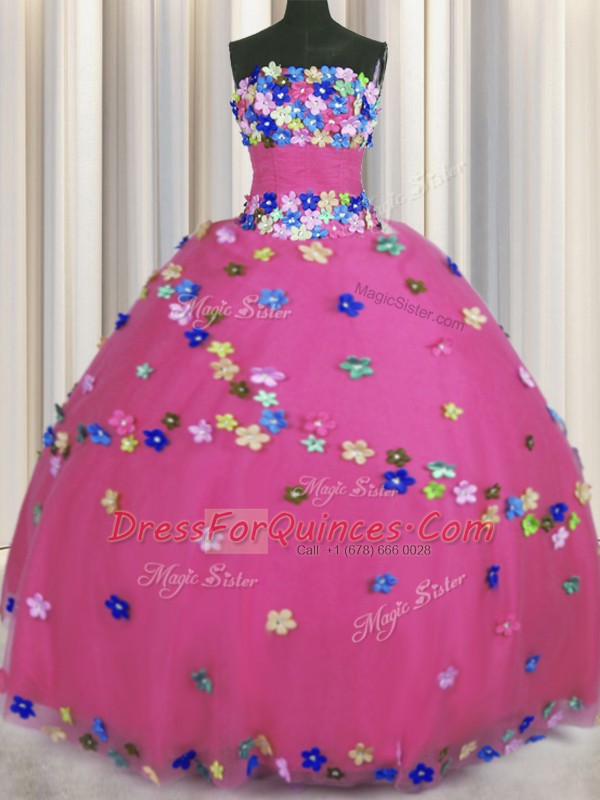 Best Selling Hot Pink Strapless Neckline Hand Made Flower Quinceanera Dress Sleeveless Lace Up