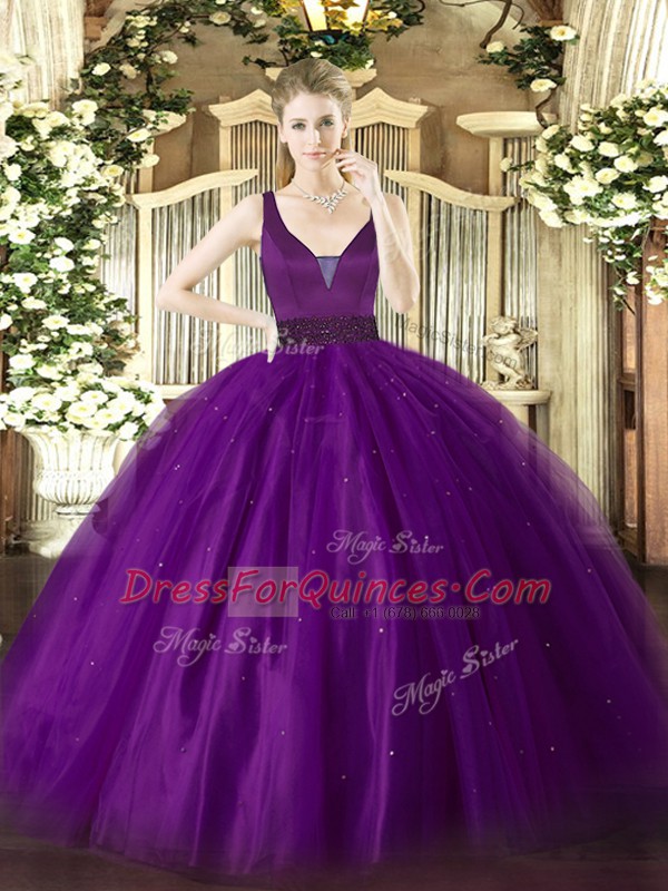 Best Selling Sleeveless Tulle Floor Length Zipper Quinceanera Dresses in Purple with Beading
