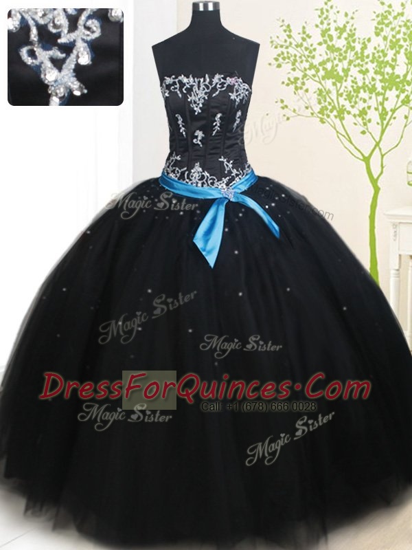 Black Strapless Neckline Beading and Belt Quince Ball Gowns Sleeveless Lace Up
