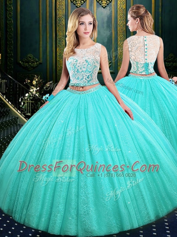 Blue Scoop Lace Up Lace and Sequins 15 Quinceanera Dress Sleeveless