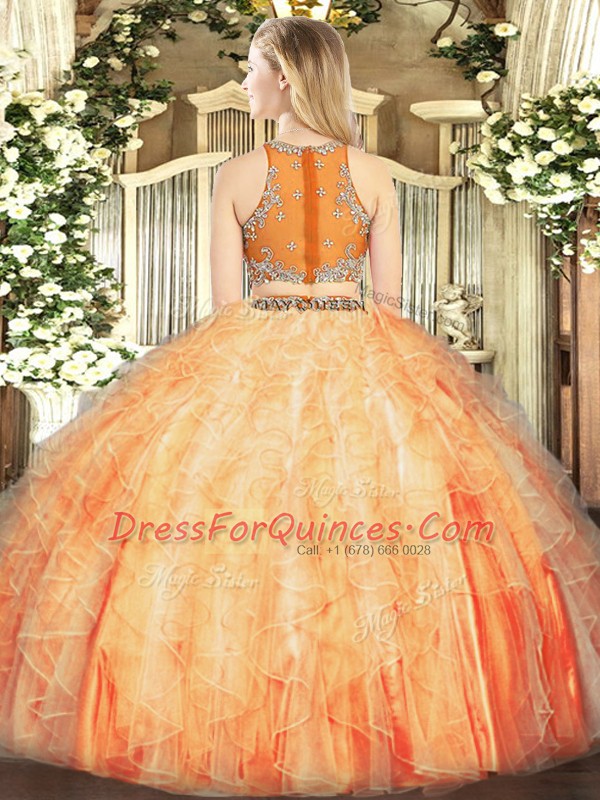 Coral Red Sleeveless Beading and Ruffles Floor Length Quince Ball Gowns