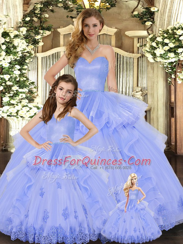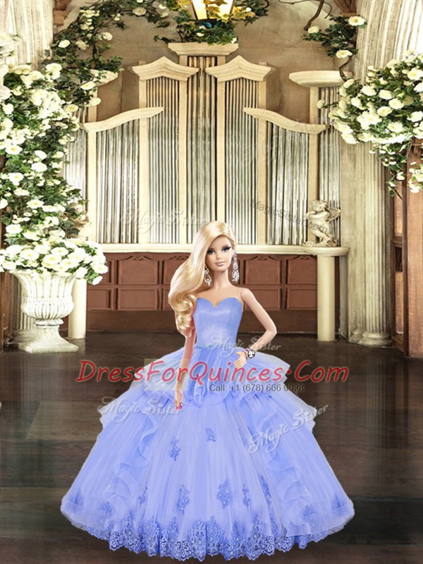 Custom Fit Lavender Quince Ball Gowns Military Ball and Sweet 16 and Quinceanera with Appliques and Ruffles Sweetheart Sleeveless Lace Up