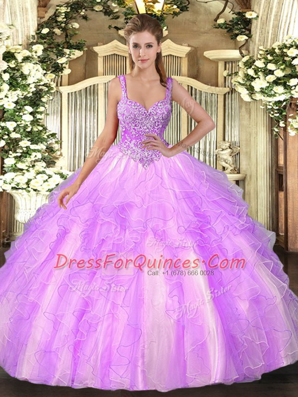 Designer Lilac Straps Lace Up Beading and Ruffles Quinceanera Gown Sleeveless