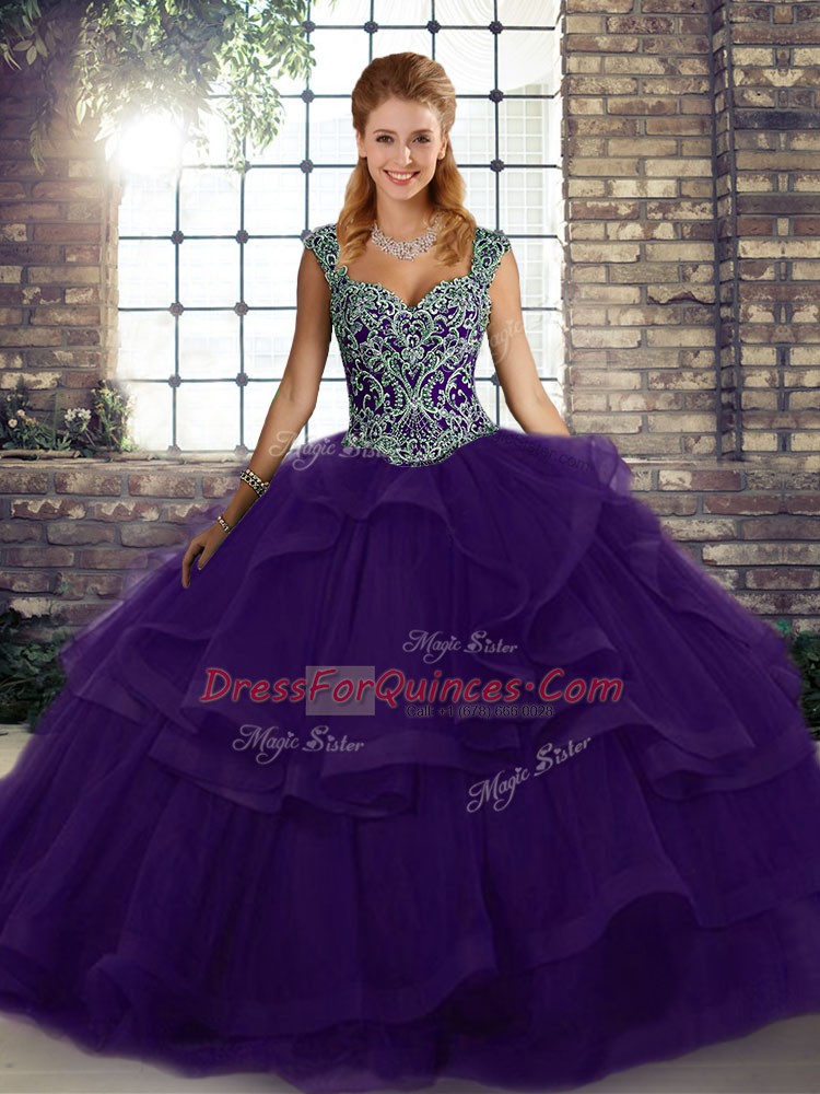 Discount Purple Ball Gowns Beading and Ruffles Sweet 16 Dress Lace Up Tulle Sleeveless Floor Length