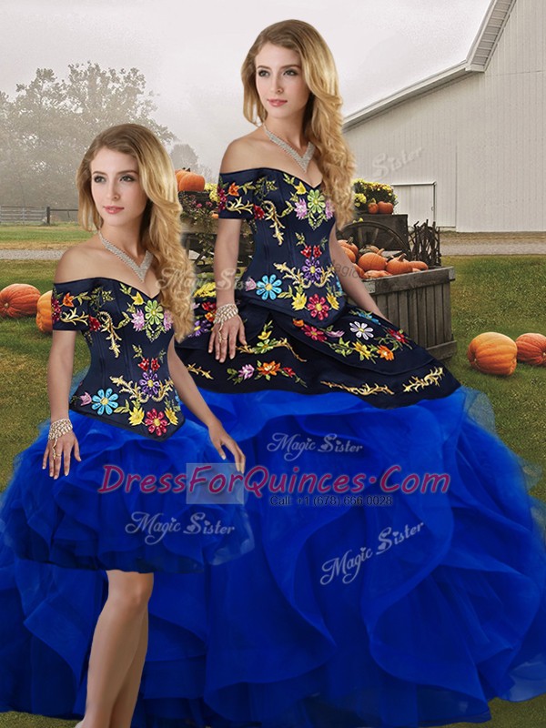 Fitting Royal Blue Off The Shoulder Neckline Embroidery and Ruffles 15th Birthday Dress Sleeveless Lace Up
