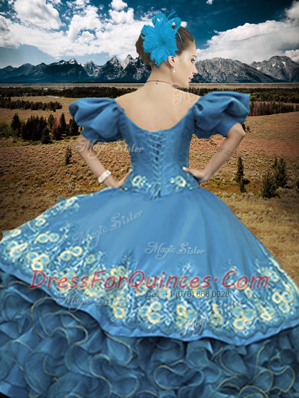 Free and Easy Blue Lace Up Off The Shoulder Appliques and Ruffles Sweet 16 Dress Organza Short Sleeves