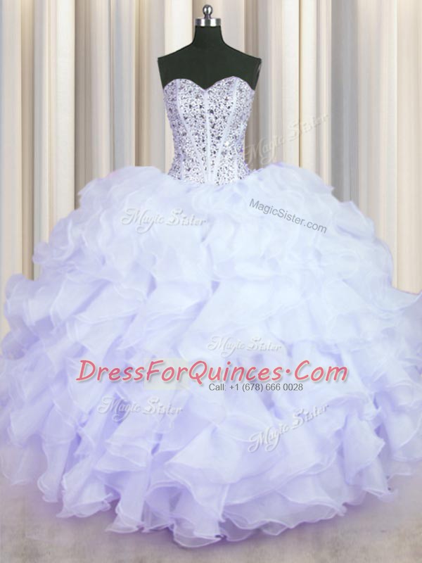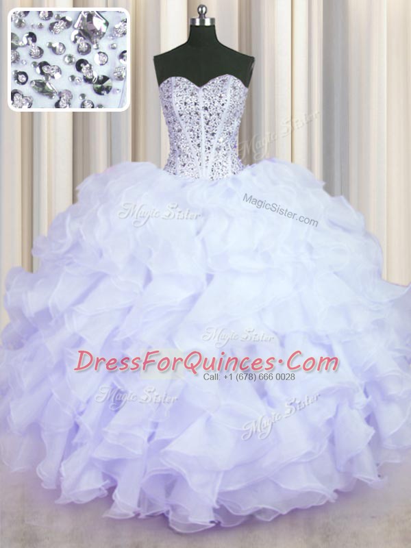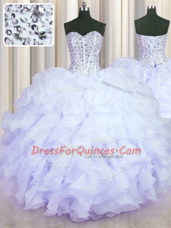 Glamorous Lavender Ball Gown Prom Dress Military Ball and Sweet 16 and Quinceanera and For with Beading and Ruffles Sweetheart Sleeveless Lace Up