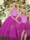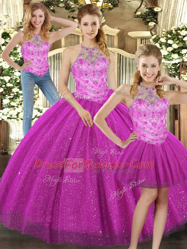 High Class Fuchsia Three Pieces Beading Vestidos de Quinceanera Lace Up Tulle Sleeveless Floor Length