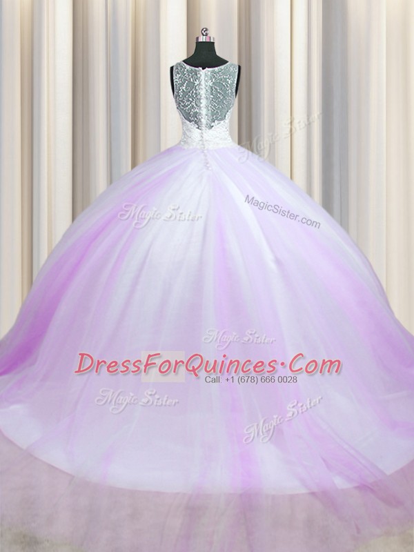 High Class Zipper Up Sleeveless Brush Train Beading Zipper Quince Ball Gowns