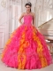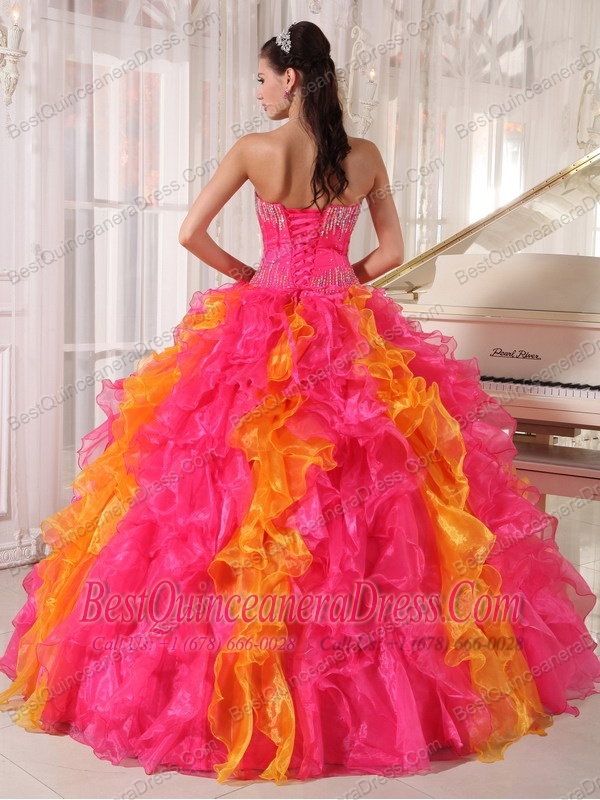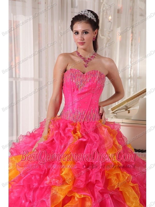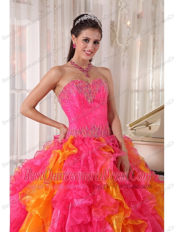 Hot Pink and Orange Ball Gown Sweetheart Floor-length Organza Sequins Quinceanera Dress