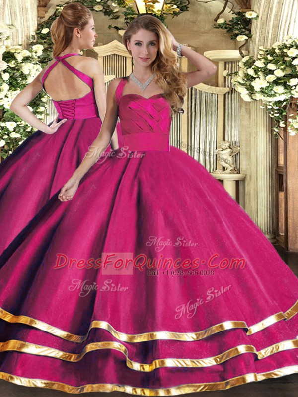 Hot Pink Lace Up 15th Birthday Dress Ruffled Layers Sleeveless Floor Length