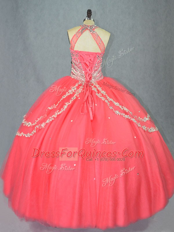 Hot Selling Beading and Ruffles Quinceanera Dresses Watermelon Red Lace Up Sleeveless Floor Length